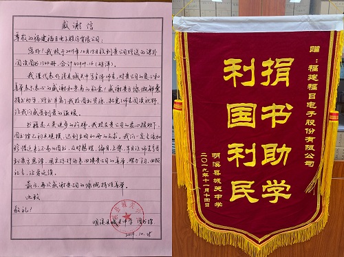 福日電子積極落實習近平總書記關于精準脫貧的重要講話精神,開展教育扶貧,履行上市公司的社會責任,響應福建省慈善總會、福建省海峽社會組織研究院共同發起的《關于開展“精準教育扶貧---捐贈電腦、圖書”專項公益活動的倡議》,為明溪縣城關中學捐贈愛心圖書約1300余冊,豐富了學校圖書室的書籍種類和內容,受到了慈善總會和學校誠摯的感謝。